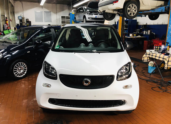 Der weisse SMART ist bei Hilger´s Werkstatt gerade eingetroffen und soll nun frisch gemacht werden.
